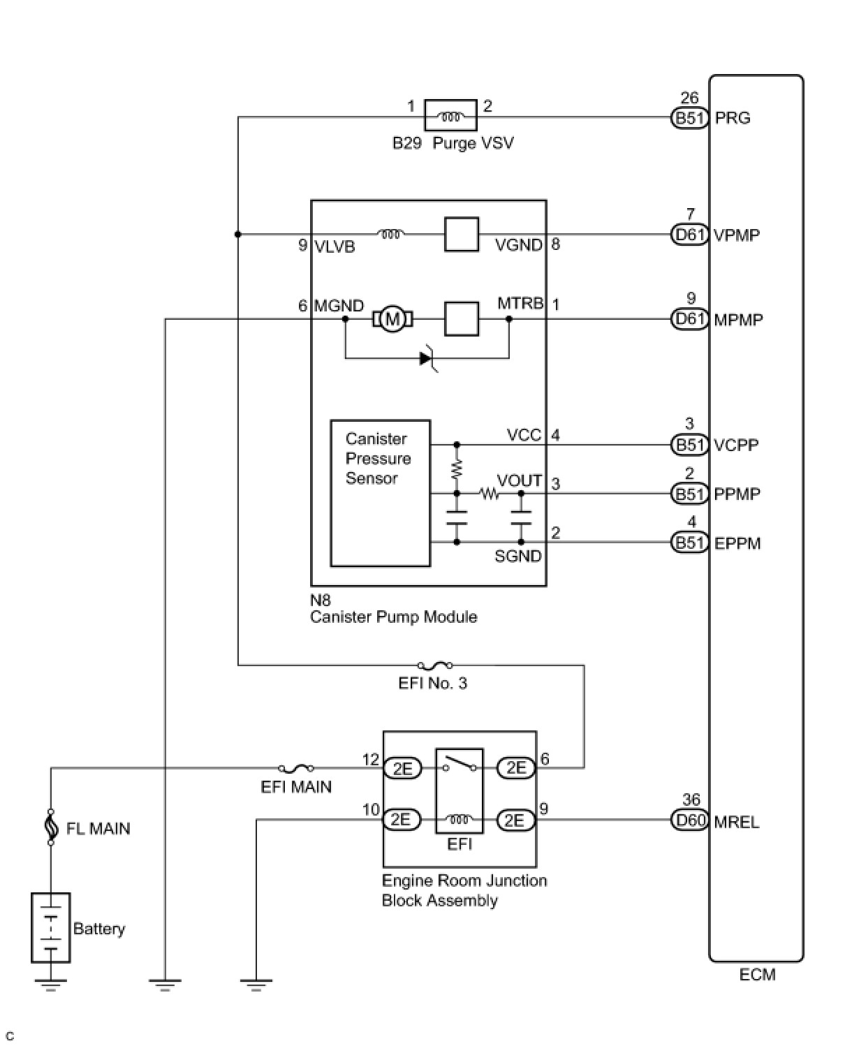 The leak detection pump creates negative pressure (vacuum) in the EVAP system, and the pressure is measured. Finally, the ECM monitors for leaks from the EVAP system and malfunctions in both the canister pump module and purge VSV, based on the EVAP pressure.
