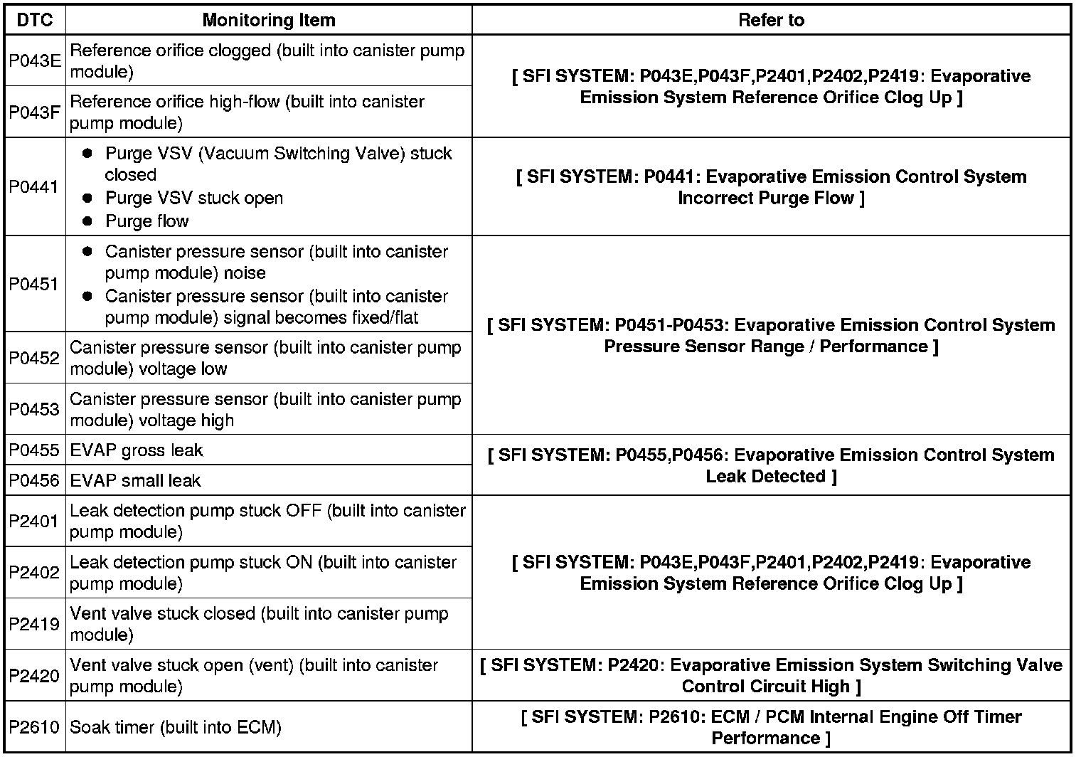 If any EVAP system DTCs are output, the malfunctioning area can be determined using the table below.