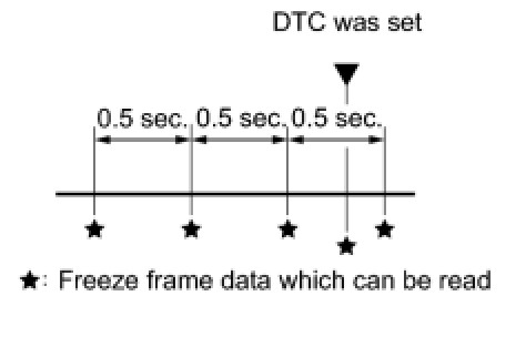 (b) The Techstream records freeze frame data in 5 different instances: 1) 3 times before the DTC is set, 2) once when the DTC is set, and 3) once after the DTC is set. These sets of data can be used to simulate the vehicle condition around the time when the malfunction occurred. The data may help in finding the cause of the malfunction, or in judging if the DTC was caused by a temporary malfunction.