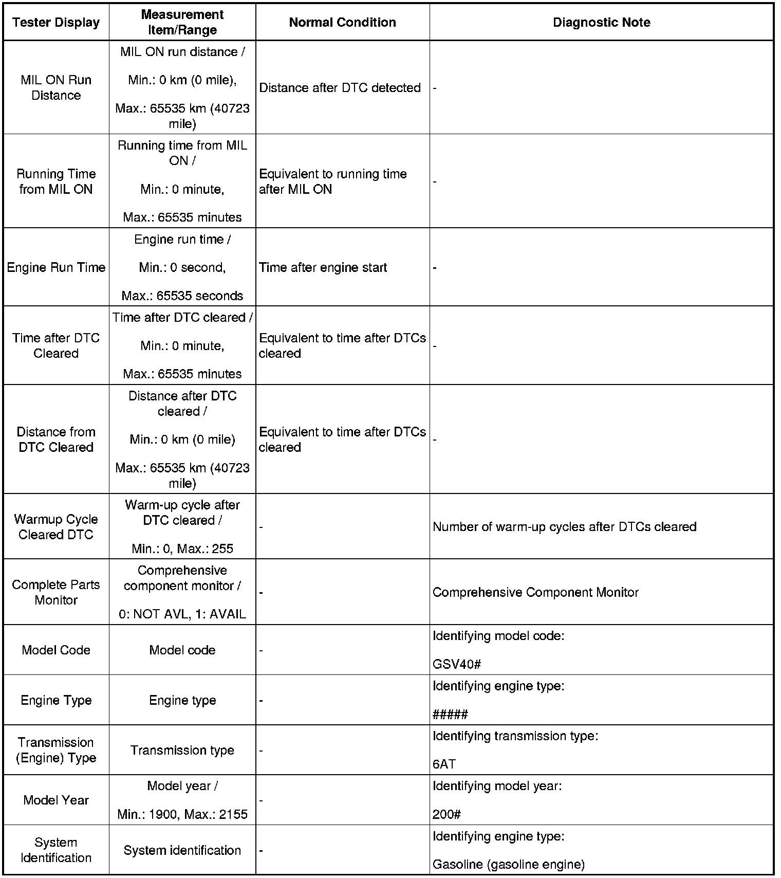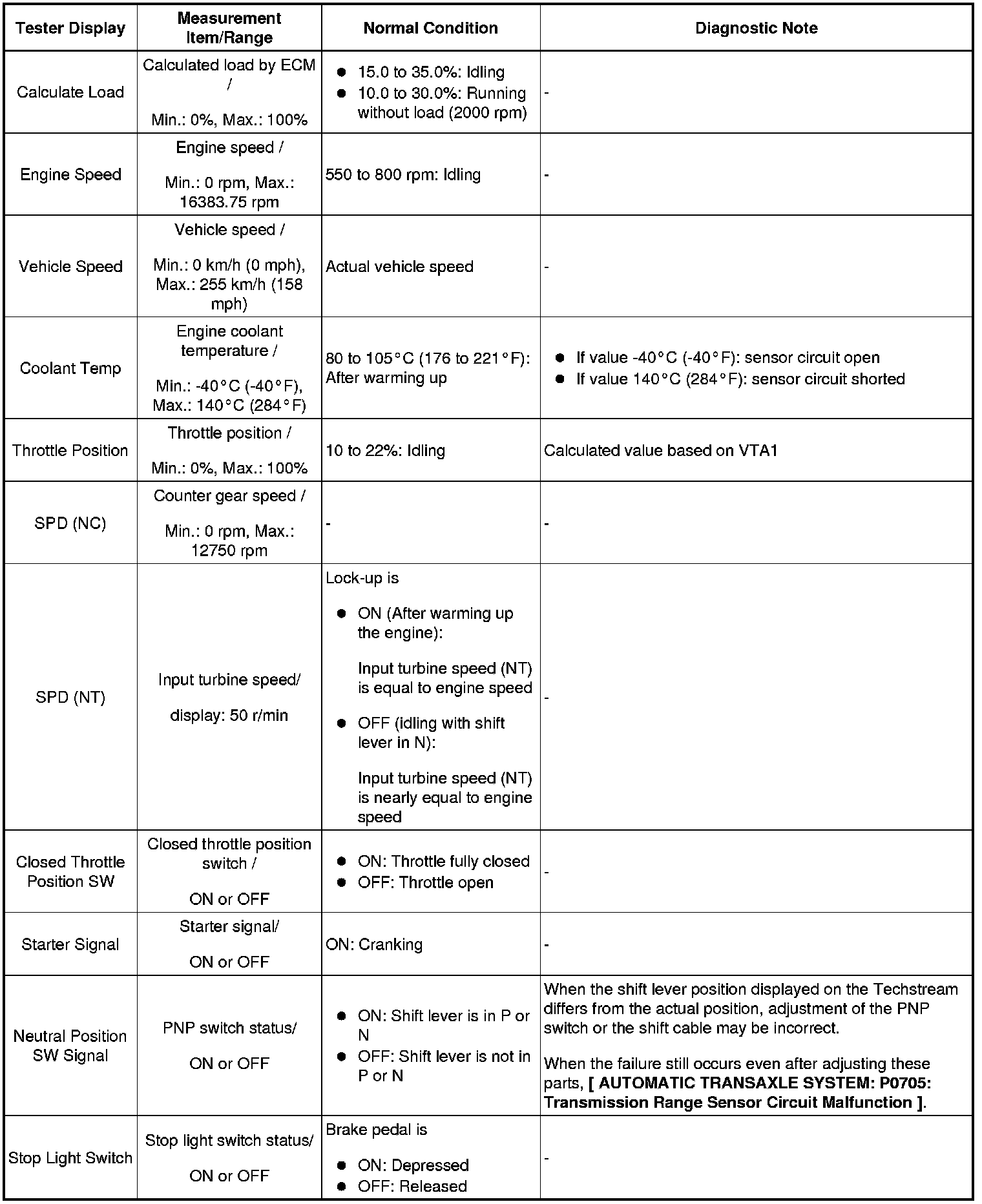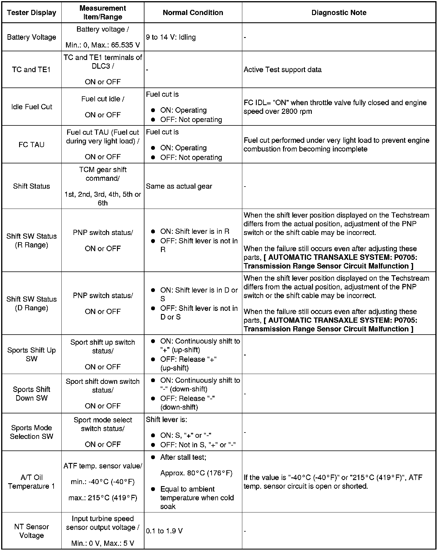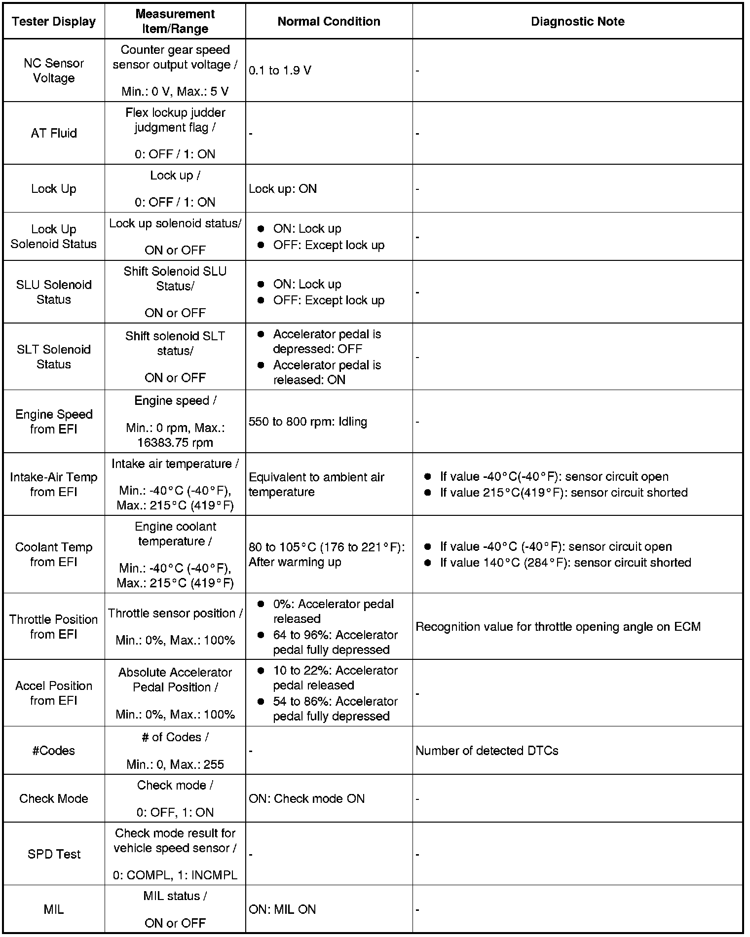 HINT: Using the Techstream to read the Data List allows the values or states of switches, sensors, actuators and other items to be read without removing any parts. This non-intrusive inspection can be very useful because intermittent conditions or signals may be discovered before parts or wiring is disturbed. Reading the Data List information early in troubleshooting is one way to save diagnostic time.