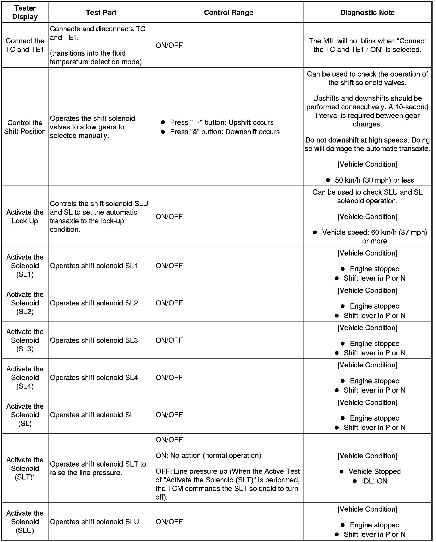 *: The "Activate the solenoid (SLT)" Active Test is performed to allow confirmation that the line pressure changes. The line pressure changes are confirmed using the same SST that is used for the Hydraulic Test Hydraulic Test.