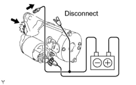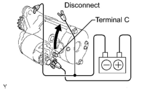 (1) While maintaining the battery connections of the pull-in test above, disconnect the negative (-) lead from terminal C. Check that the pinion gear remains extended.