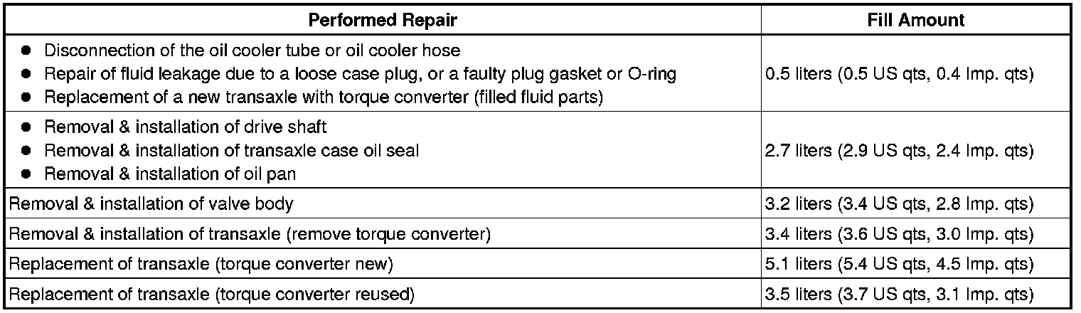 (a) Fill the transaxle with the correct amount of fluid as listed in the table below.