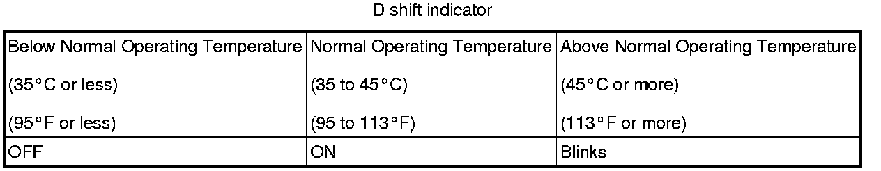 HINT: In the fluid temperature detection mode, the D shift indicator comes on, goes off, or blinks depending on the fluid temperature.