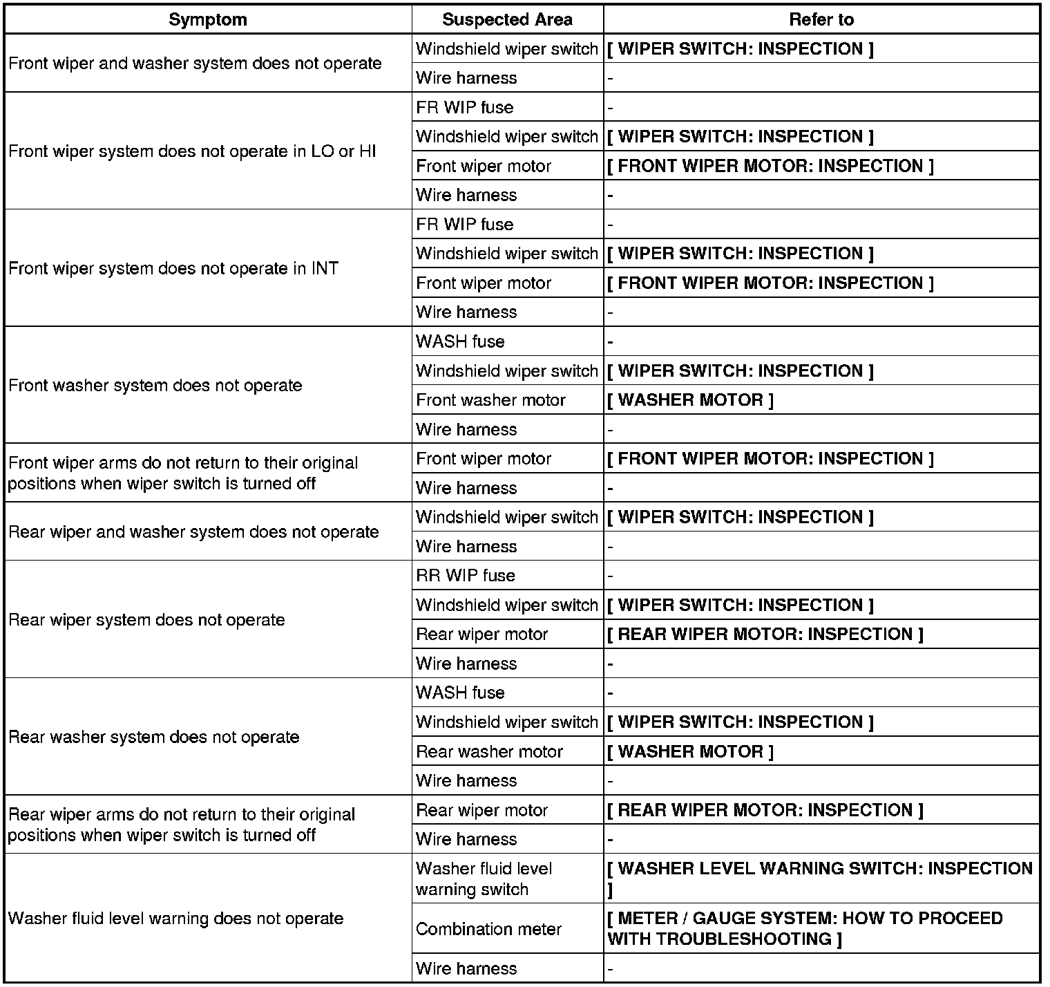WIPER AND WASHER: WIPER AND WASHER SYSTEM: PROBLEM SYMPTOMS TABLE