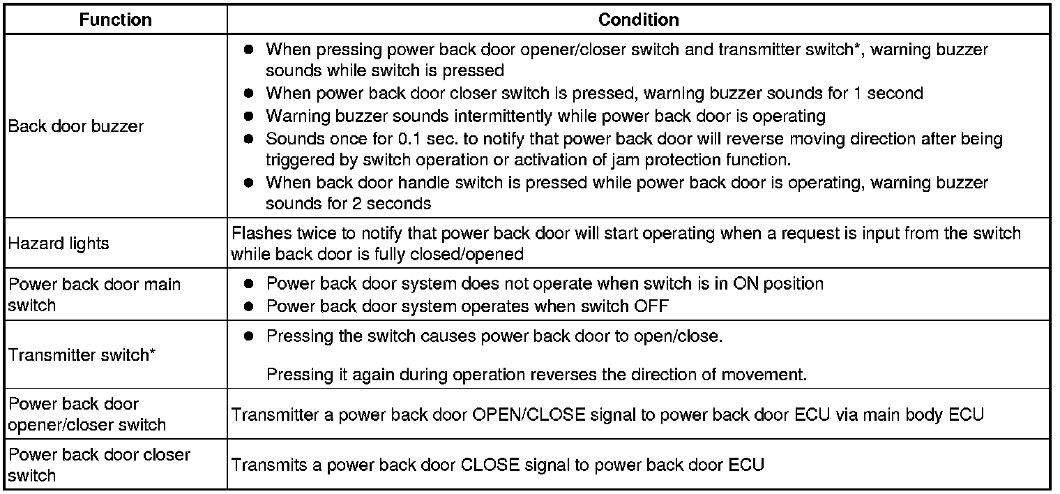 (5) The power back door system sets off an alarm (using a buzzer) and hazard warning lights when the power back door starts operating.