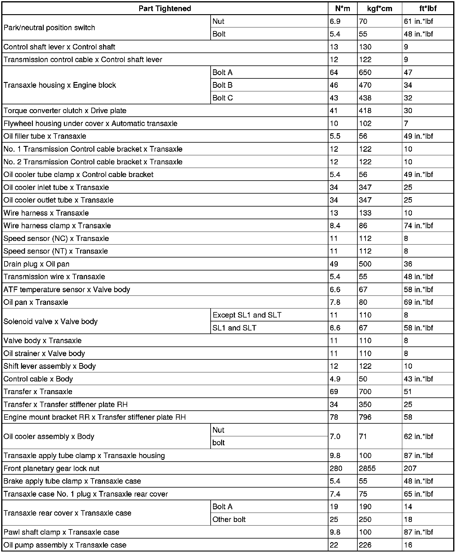 SERVICE SPECIFICATIONS: U151F AUTOMATIC TRANSAXLE: TORQUE SPECIFICATIONS