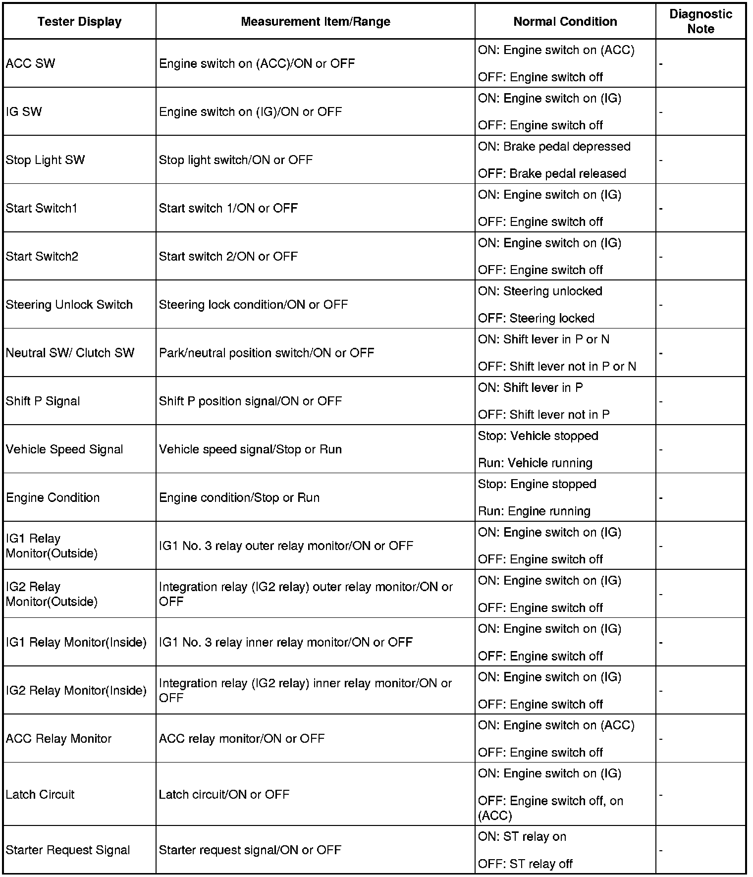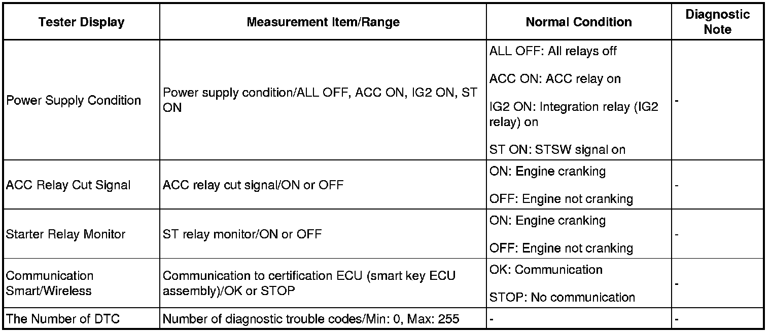 HINT: Using the Techstream to read the Data List allows the values or states of switches, sensors, actuators and other items to be read without removing any parts. This non-intrusive inspection can be very useful because intermittent conditions or signals may be discovered before parts or wiring is disturbed. Reading the Data List information early in troubleshooting is one way to save diagnostic time.