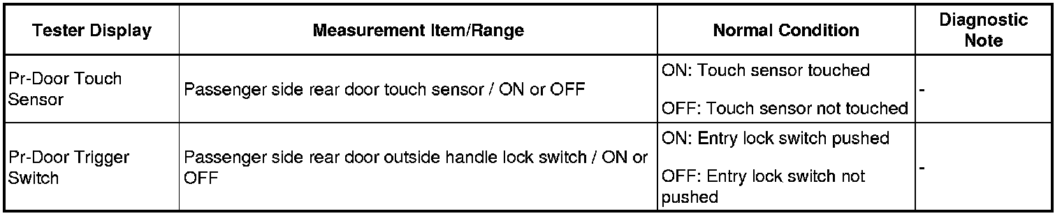 When the passenger side rear door entry lock and unlock functions do not operate, one of the following may be malfunctioning: 1) power door lock system, 2) passenger side rear door electrical key oscillator, or 3) certification ECU (smart key ECU assembly).