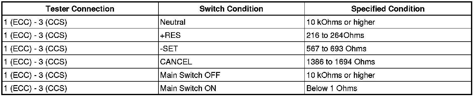 If the result is not as specified, replace the cruise control main switch assembly.