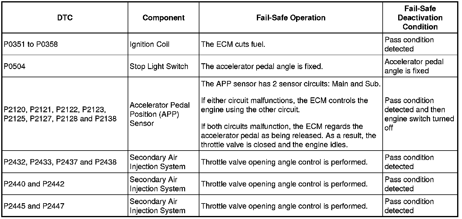 If any of the following DTCs are stored, the ECM enters fail-safe mode to allow the vehicle to be driven temporarily.