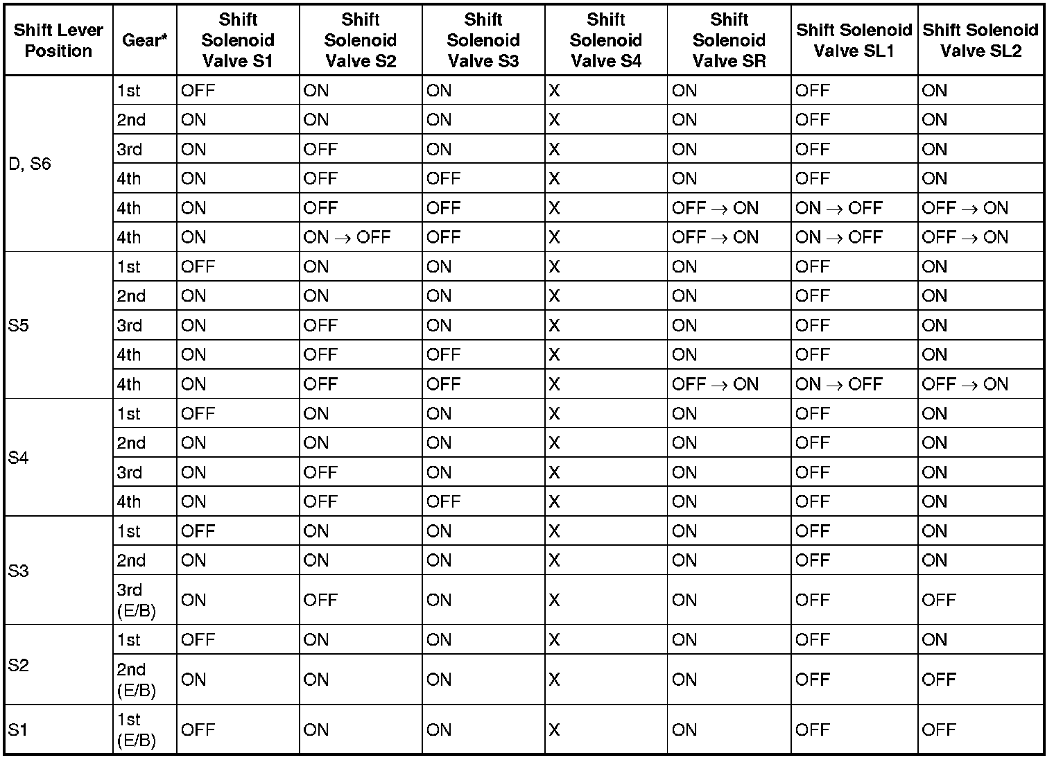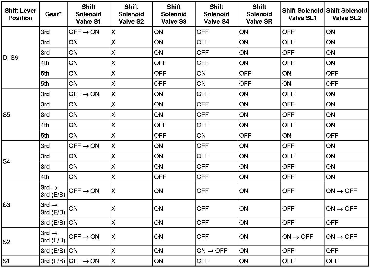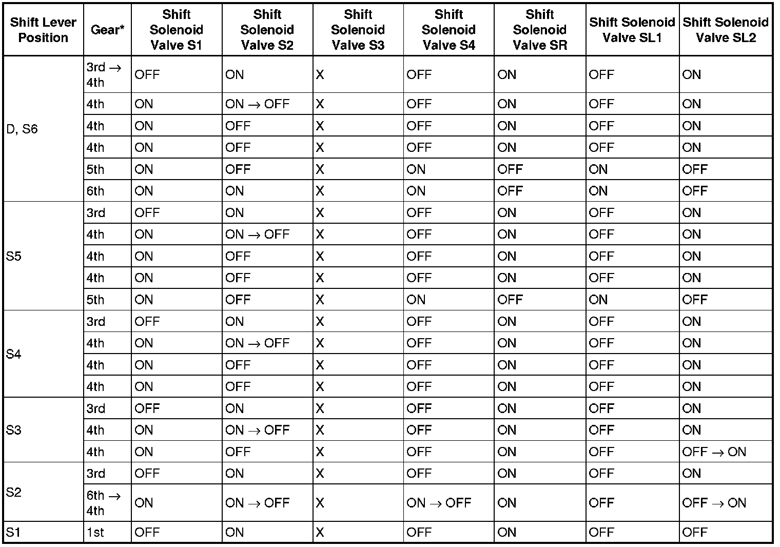 Shift Solenoid Valve Normal Operation Chart