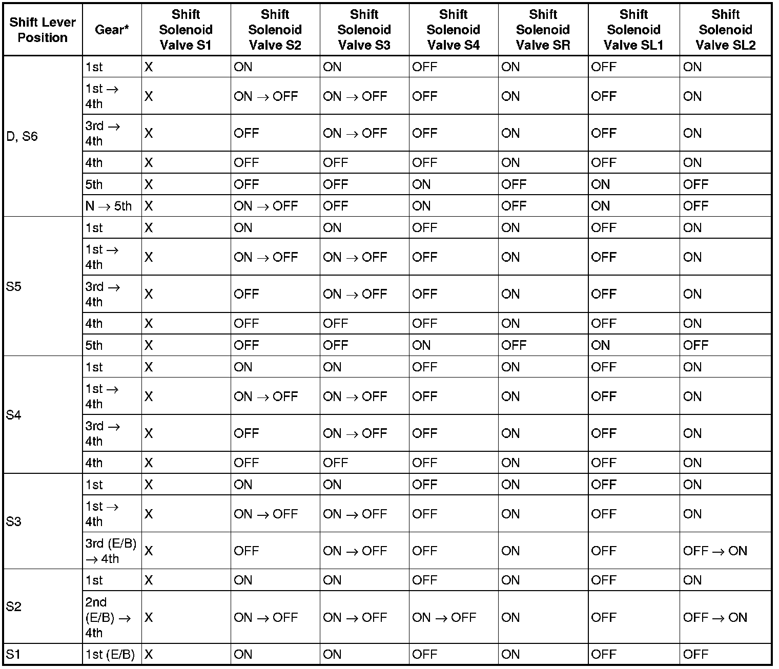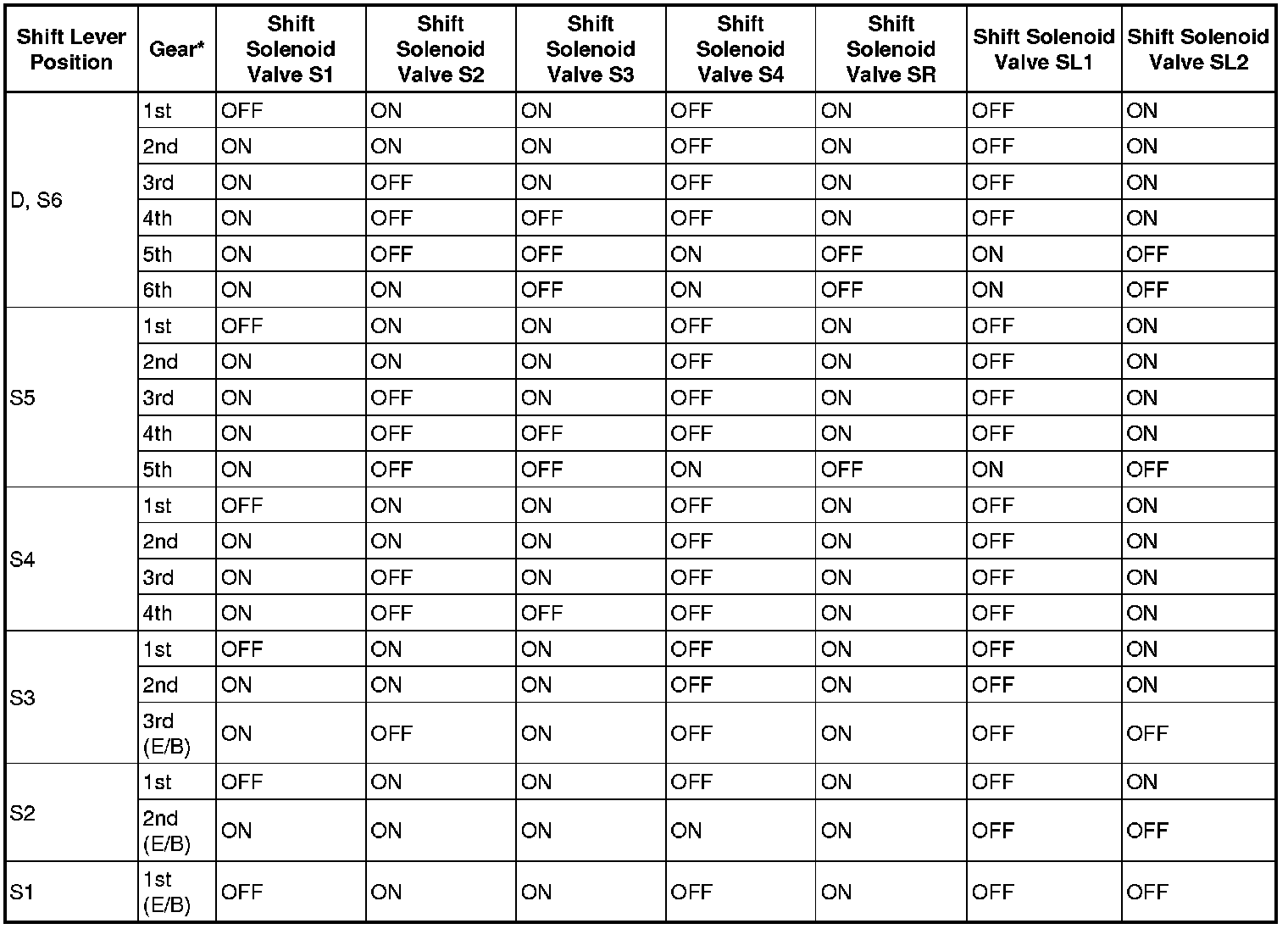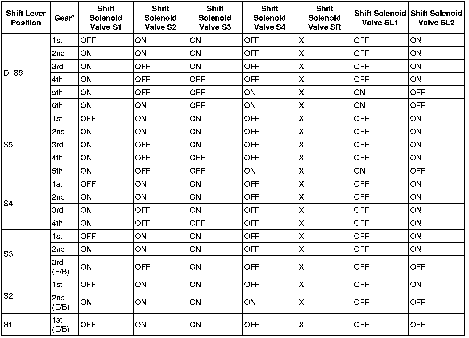 Shift Solenoid Valve Normal Operation Chart