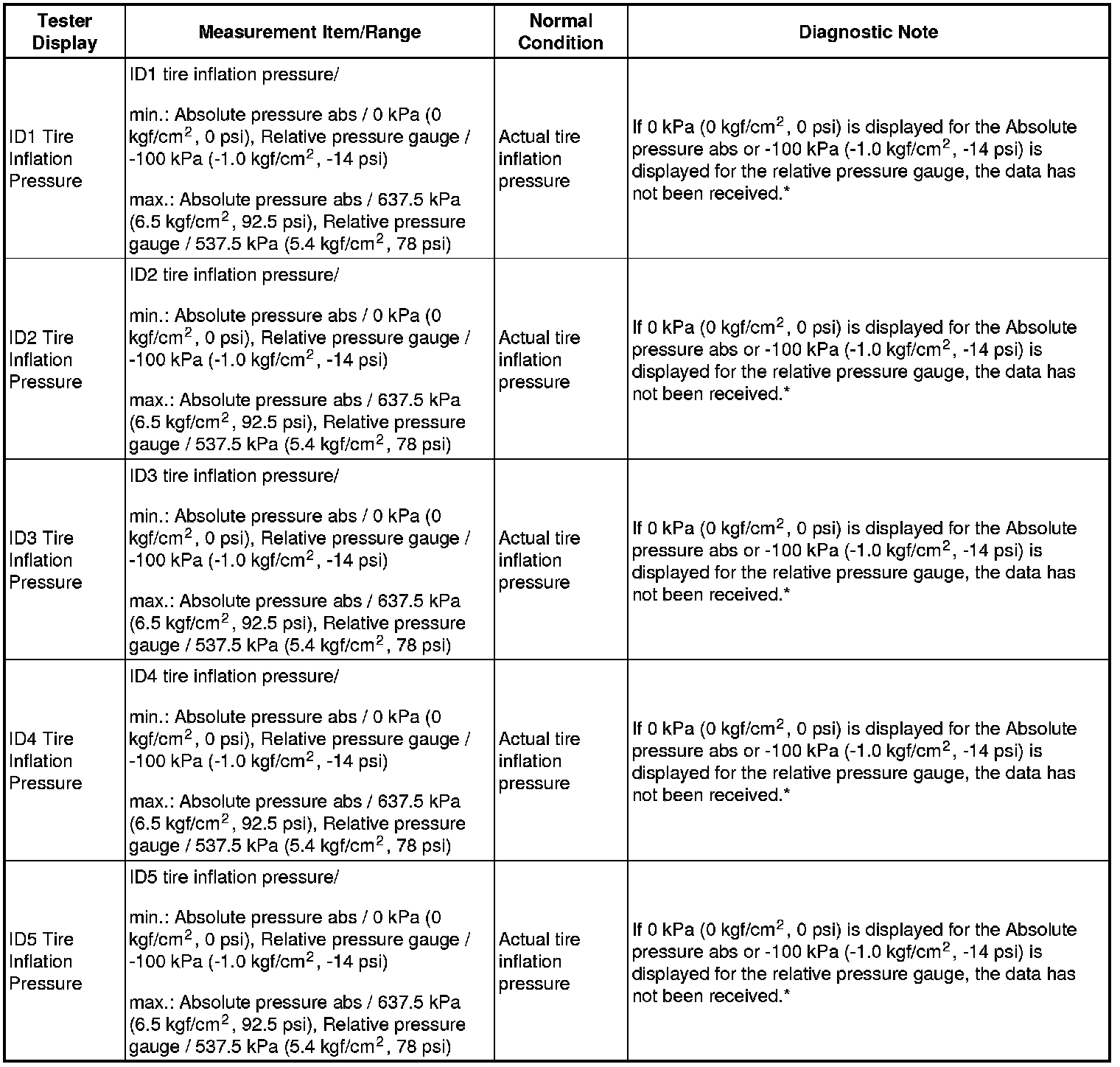 - The initialization is complete when the Data List "ID Tire Inflation Pressure" display shows the correct pressures.