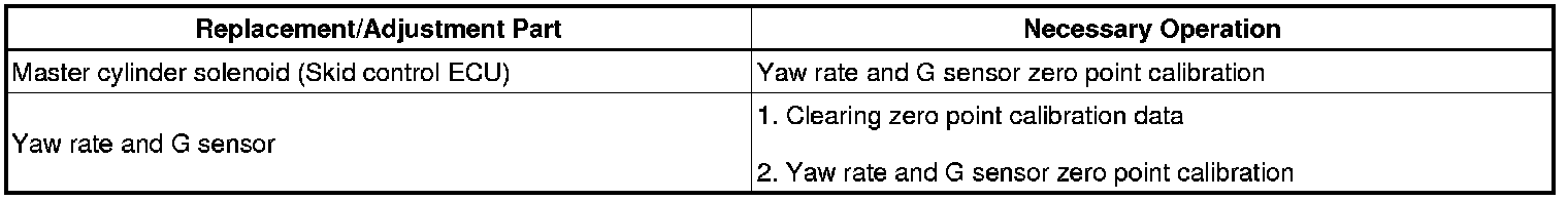 After replacing the yaw rate and G sensor, make sure to clear the zero point calibration data in the skid control ECU and perform zero point calibration.
