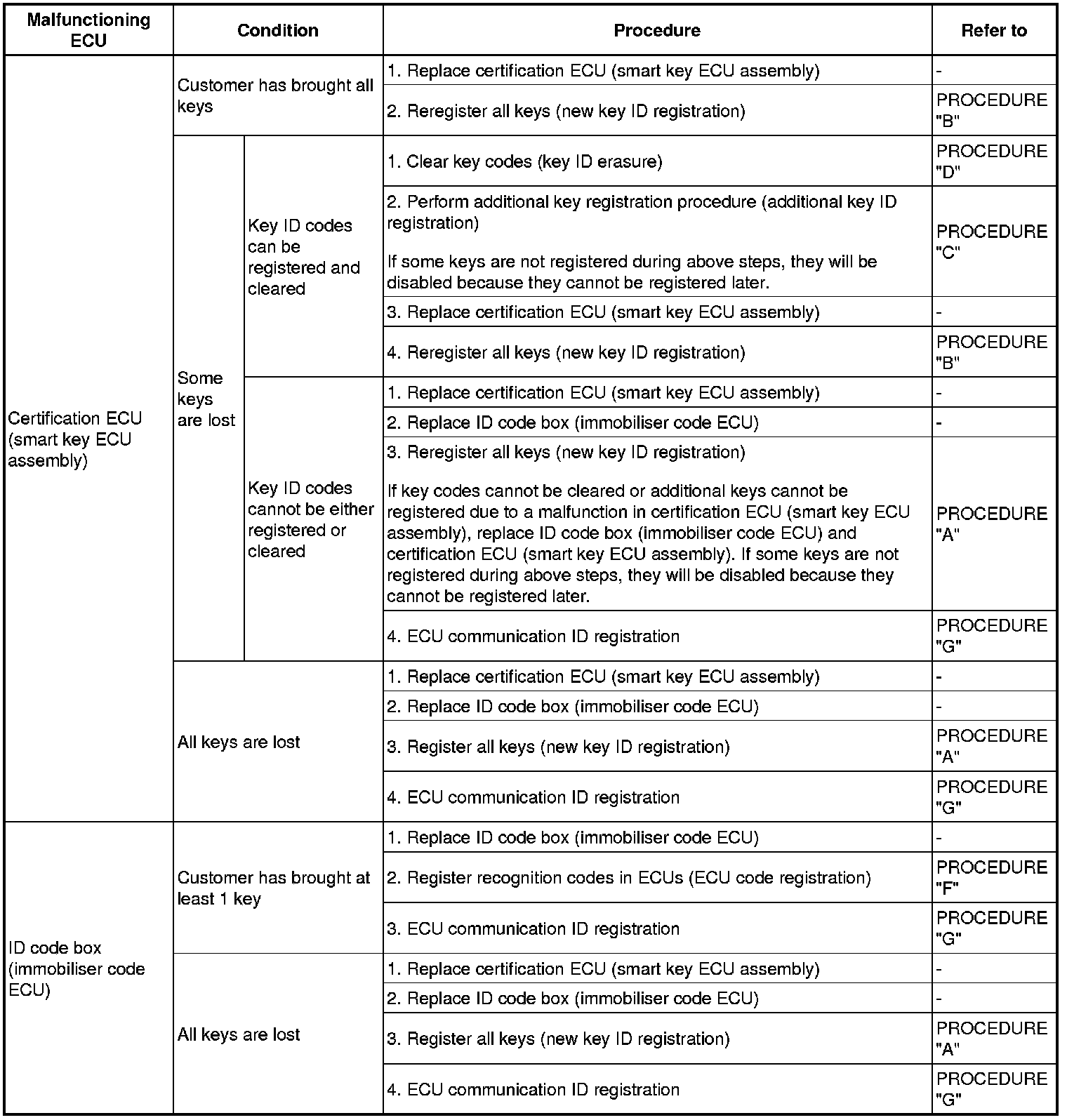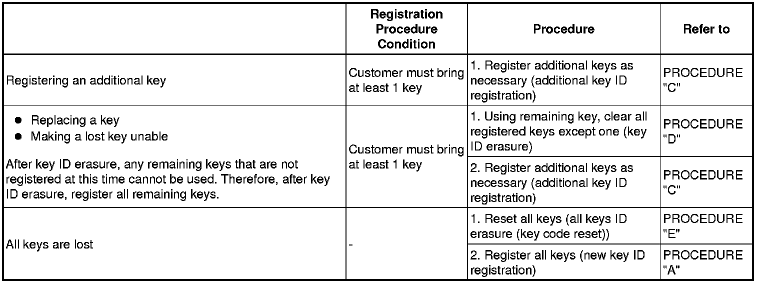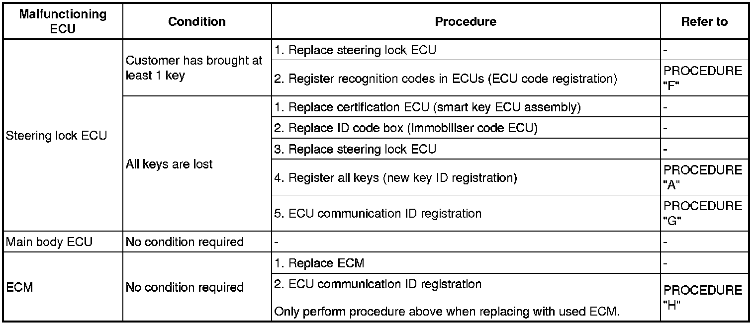 (1) If a malfunctioning ECU is discovered through troubleshooting of the smart key system, use the ECU replacement and key registration procedures in the table below.