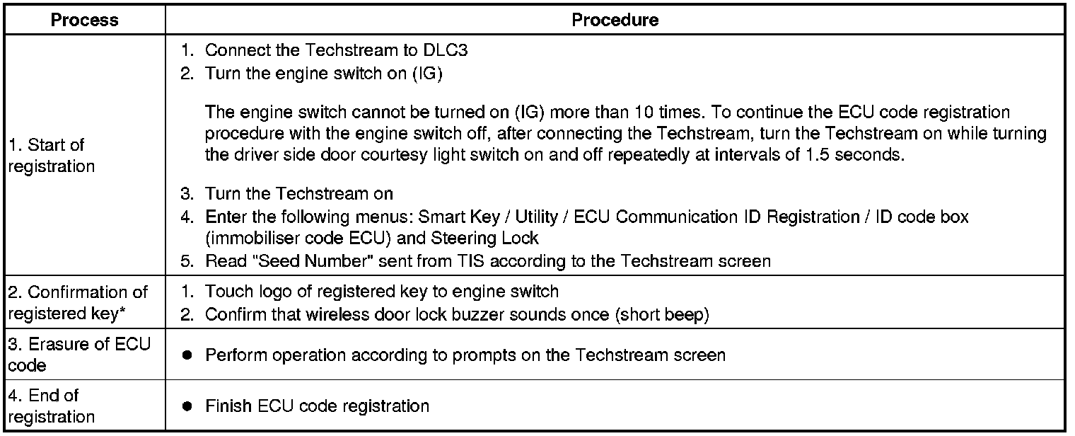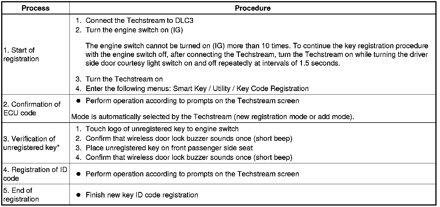 HINT: *: Perform this process for one of the keys registered to the vehicle. Finish the procedure within 30 seconds. If the procedure has not been finished within the specified time, perform the registration from process 1 again.