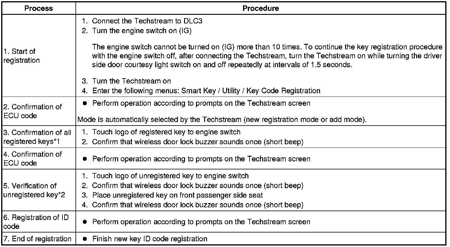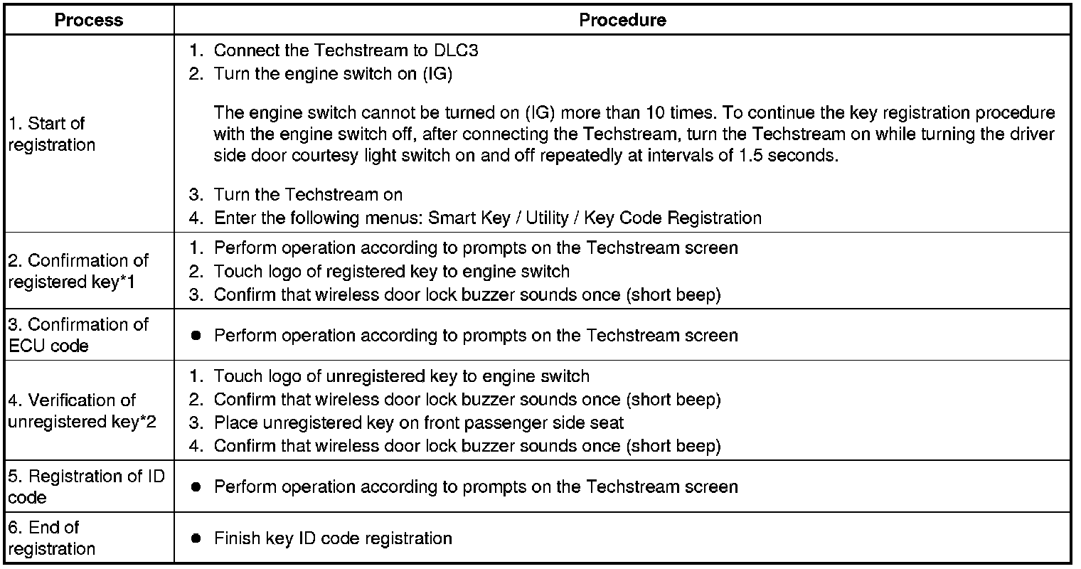 - *1: Perform this process for one of the keys registered to the vehicle. Finish the procedure within 30 seconds. If the procedure has not been finished within the specified time, perform the registration from process 1 again.