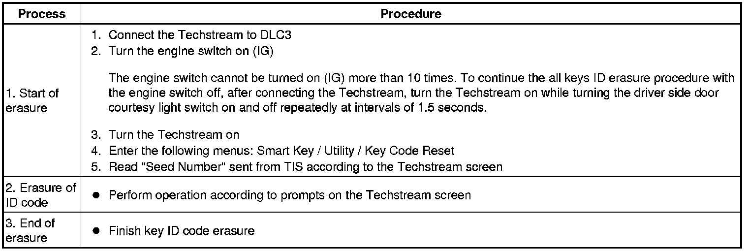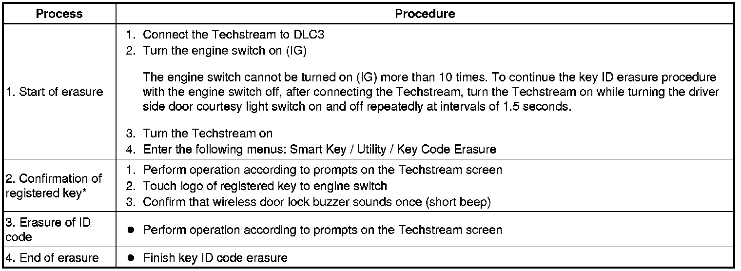 HINT: *: Perform this process for one of the keys registered to the vehicle. Finish the procedure within 30 seconds. If the procedure has not been finished within the specified time, perform the erasure from process 1 again.