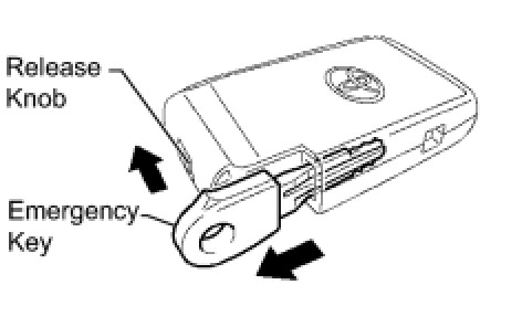 (a) Push and hold the release knob in the direction indicated by the arrow in the illustration. Take the emergency key out of the case.