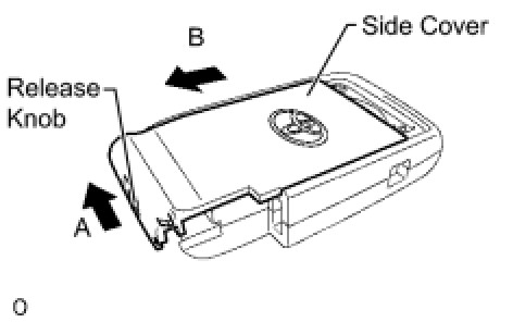 (b) Push and hold the release knob in the direction indicated by the arrow labeled A. Push out the side cover in the direction indicated by the arrow labeled B and remove the side cover.