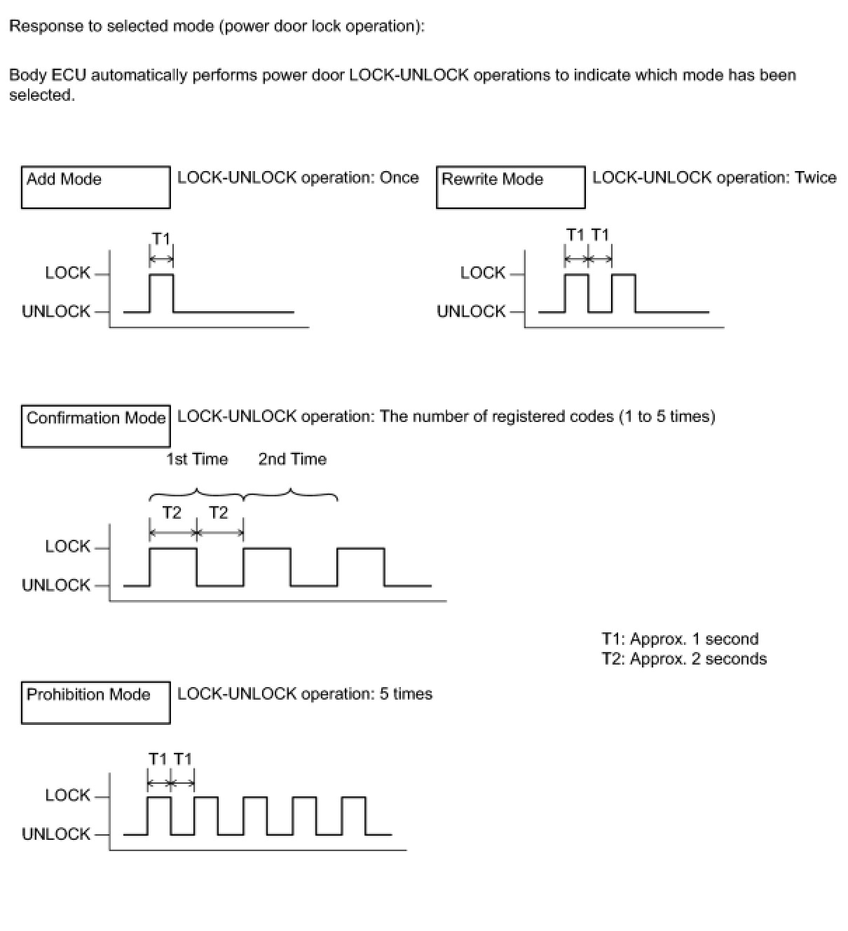 - In the confirmation mode, LOCK-UNLOCK operation will occur once for each recognition code that has been registered. For example, if 2 recognition codes have been registered, LOCK-UNLOCK operation will occur twice.