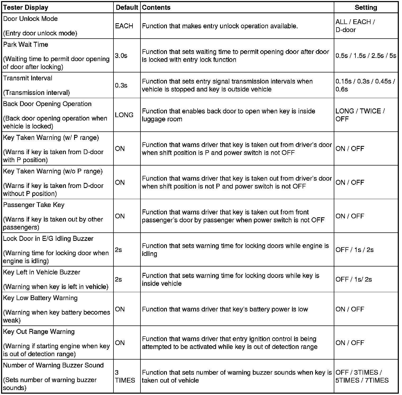 DOOR LOCK: SMART KEY SYSTEM: CUSTOMIZE PARAMETERS