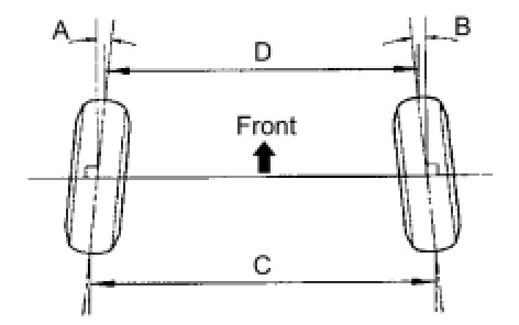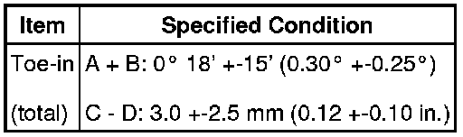 - If the toe-in is not within the specified range, inspect the suspension parts for damage and/or wear, and replace them if necessary.