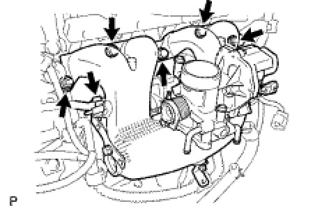 (l) Remove the 3 bolts, 2 nuts and intake manifold.