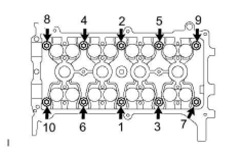 CYLINDER HEADUsing several steps, install and tighten the 10 cylinder head bolts and plate washers uniformly with an 8 mm bi-hexagon wrench in the sequence shown in the illustration.