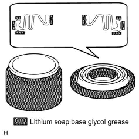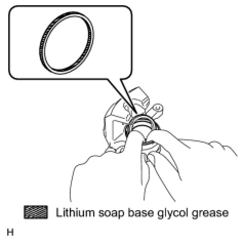 (a) Apply lithium soap base glycol grease to the inner and outer circumference of a new cylinder boot, as well as the entire circumference of the top and bottom of the outer edge, as shown in the illustration.