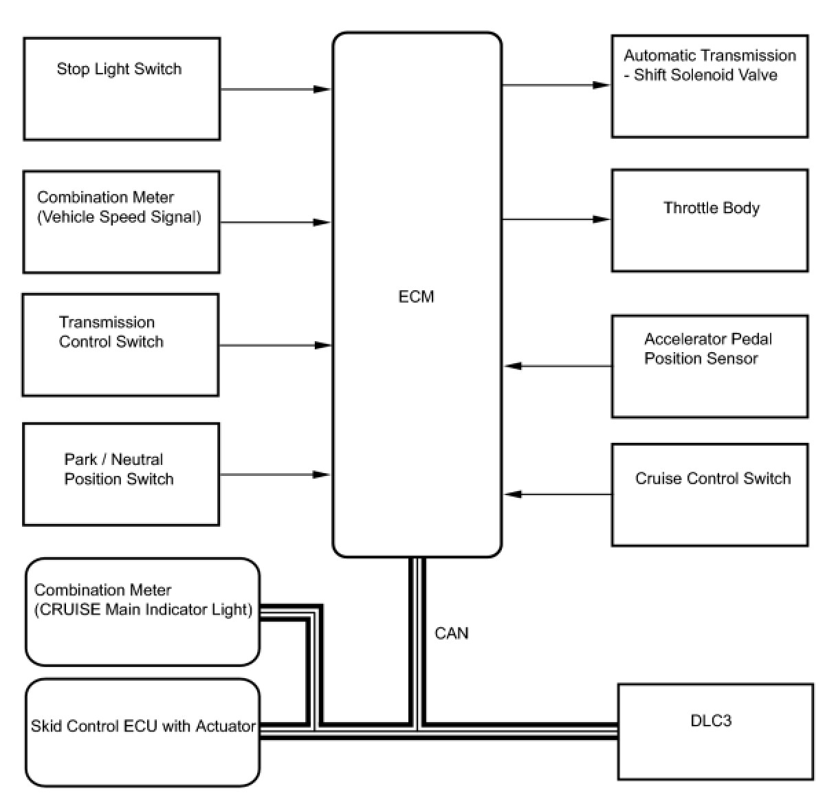 - The ECM cancels the cruise control system when the shift lever is moved from D or 3 to a position other than D or 3, and the ECM receives the park/neutral position switch signal. (for 2AR-FE)