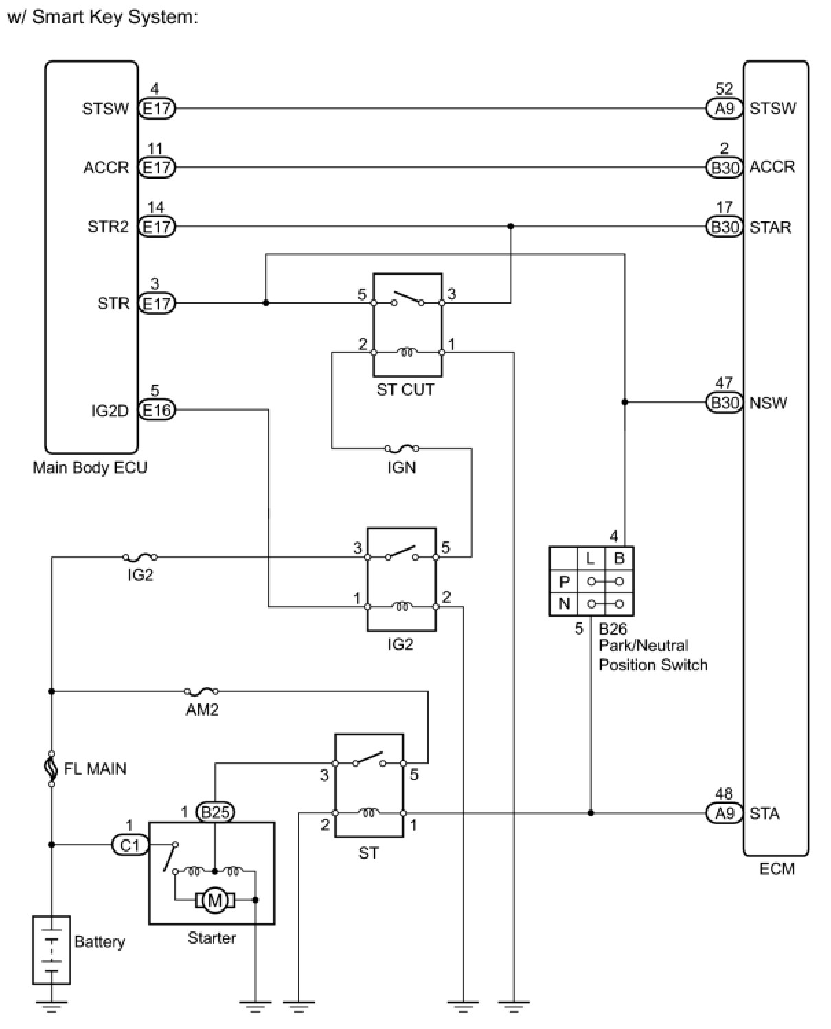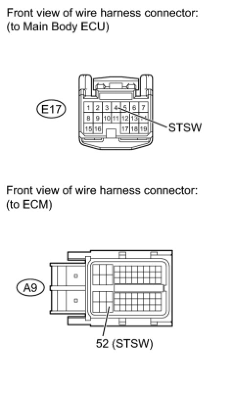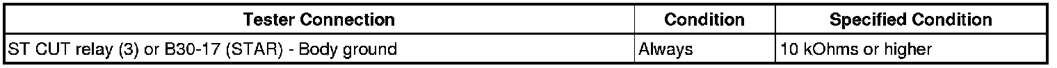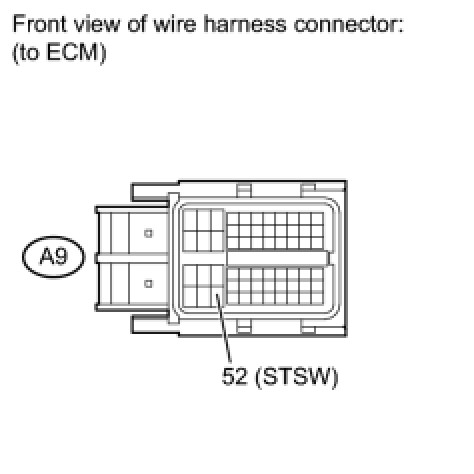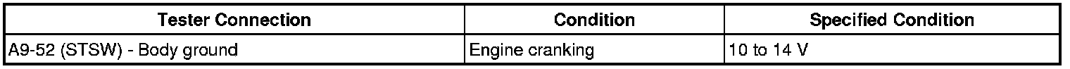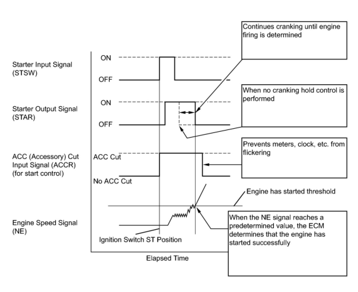 When the ECM detects the STSW signal, the ECM outputs the starter relay drive signal (STAR signal) to the starter relay through the clutch start switch or park/neutral position switch, and then the engine is cranked. The ECM stops outputting the STAR signal when a variety of conditions are met, such as when the NE signal reaches a predetermined value and when the engine speed is stable. Also, the ECM monitors the ST relay operating conditions based on the STA terminal voltage status.