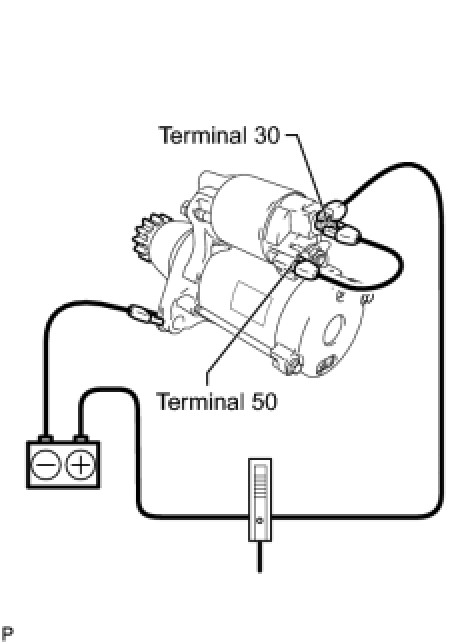 (2) Connect the battery to the magnet starter switch as shown in the illustration. Check that the clutch pinion gear extends.