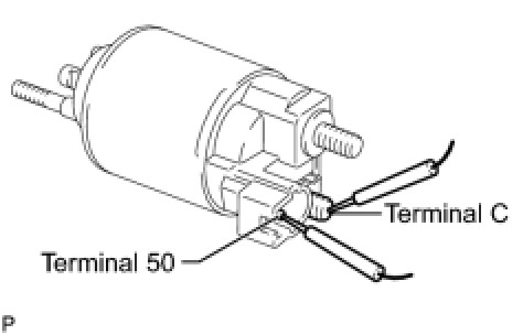 (1) Maintain the battery connections of the pull-in test above, but disconnect the negative (-) lead from terminal C. Check that the pinion gear remains extended.