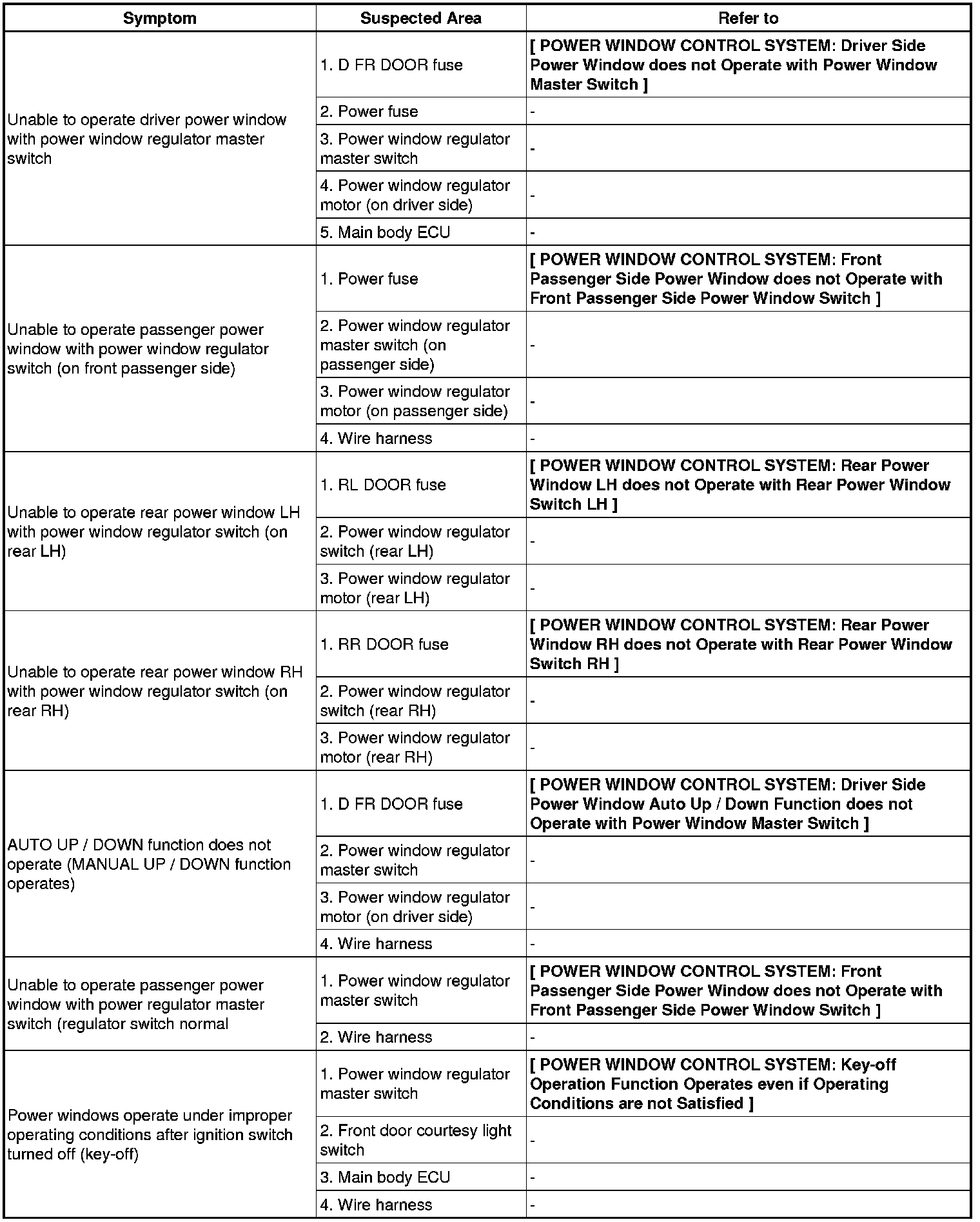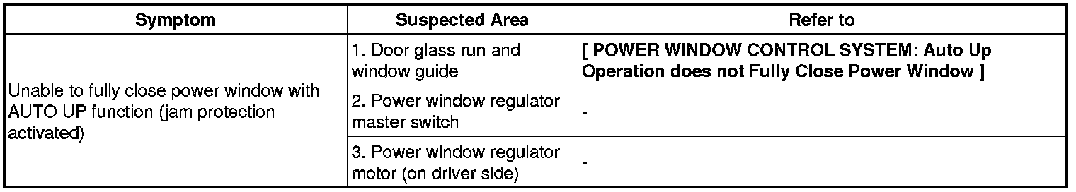 / WINDOWGLASS: POWER WINDOW CONTROL SYSTEM: PROBLEM SYMPTOMS TABLE