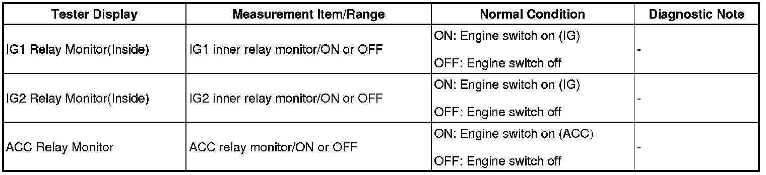 When the engine switch is turned on (IG), IG1 Relay Monitor(Inside) is ON and IG2 Relay Monitor(Inside) is ON.