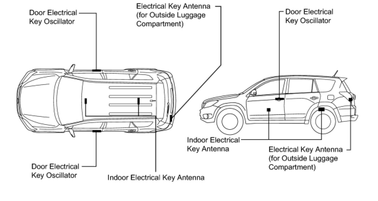 (5) If the key is outside the vehicle but is very close to a window or door handle (the ECU determines that the key is inside the vehicle) and the transmitter or mechanical key is used to lock the doors (entry lock is not used), entry unlock will not operate. To unlock the doors, perform a wireless door unlock operation. The entry lock function operates in this way to prevent doors from being unlocked by the door oscillator (vehicle exterior) without the knowledge of the user. For example, when a user operates the wireless door lock operation from inside the vehicle, radio waves from a door electrical key oscillator may leak into the vehicle interior.