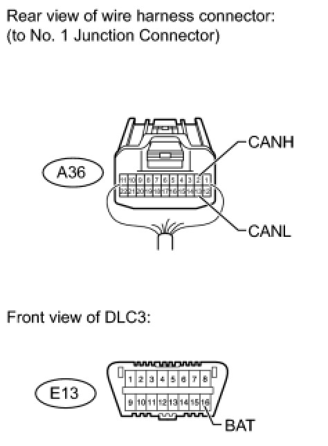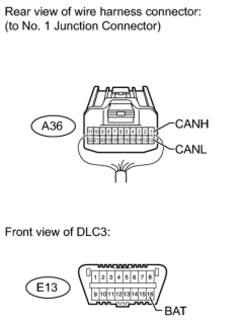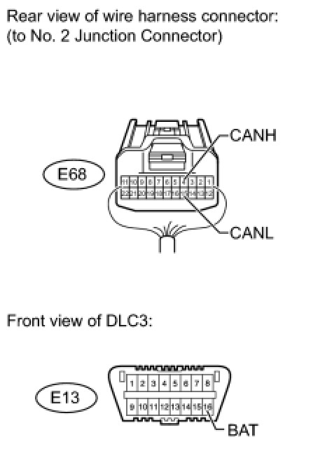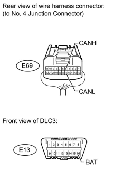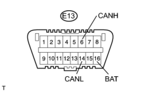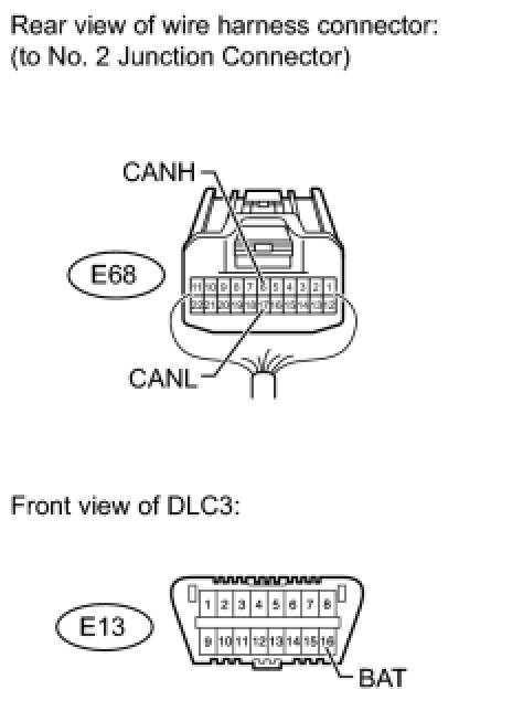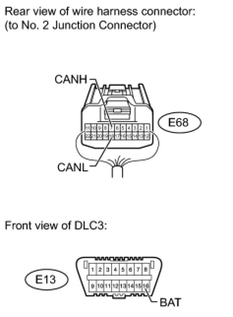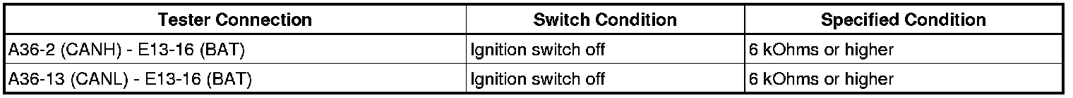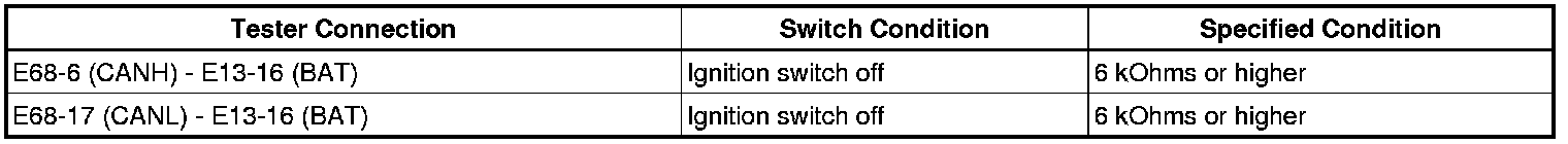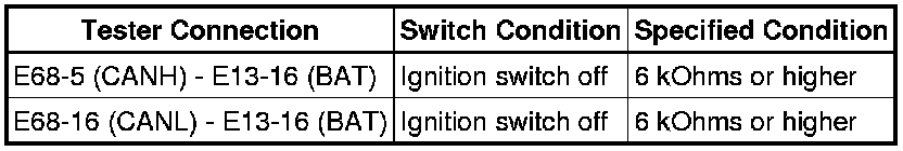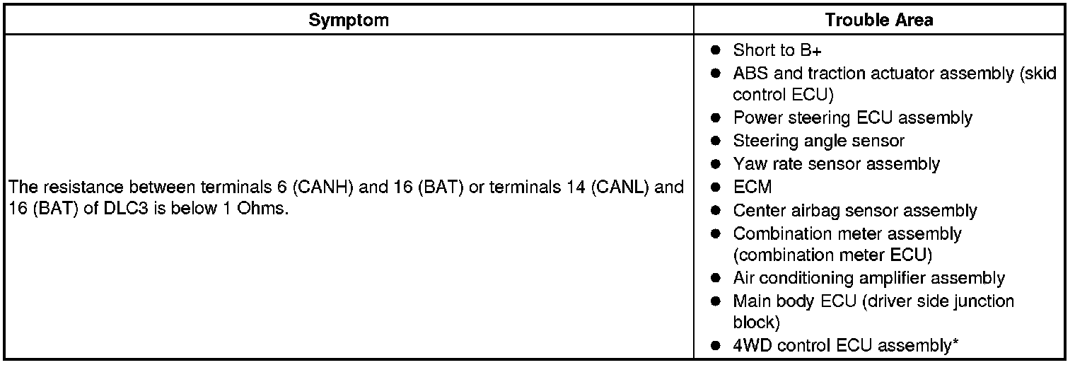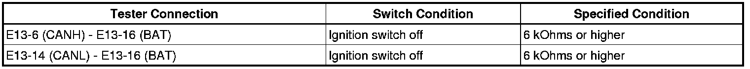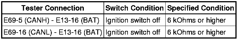 There may be a short circuit between the CAN bus line and B+ when the resistance between terminals 6 (CANH) and 16 (BAT) or terminals 14 (CANL) and 16 (BAT) of the DLC3 is below 1 Ohms.