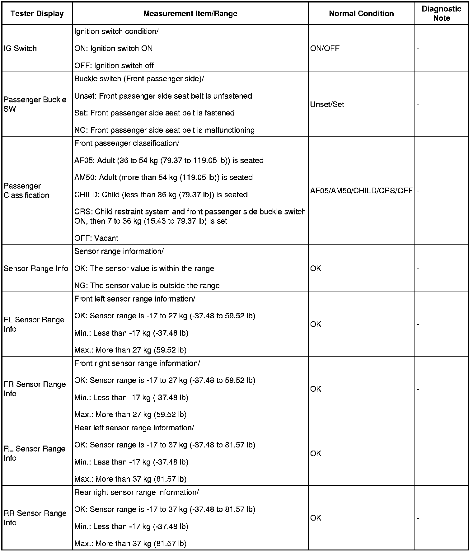1. DATA LIST FOR OCCUPANT CLASSIFICATION ECU