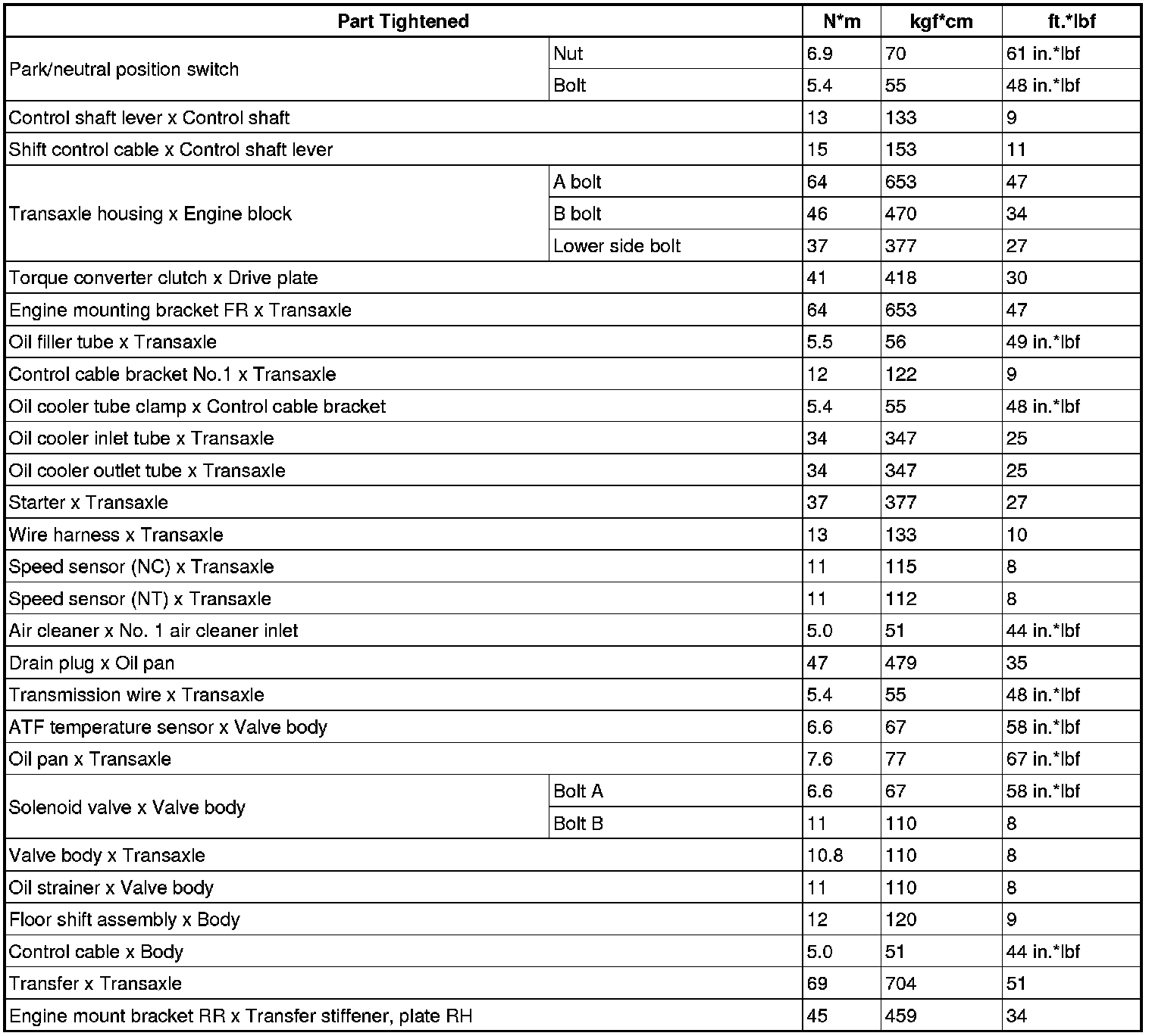 SERVICE SPECIFICATIONS: U140F AUTOMATIC TRANSAXLE: TORQUE SPECIFICATIONS