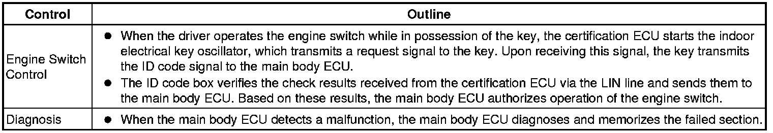 (a) The push-button start uses a push-type engine switch, which the driver can operate by merely carrying the key. This system consists primarily of the main body ECU, engine switch, ID code box, steering lock ECU, key, ACC relay, IG1 relay, IG2 relay and certification ECU. The main body ECU controls the system. This function operates in cooperation with the smart key system. The table below shows the transition of the engine switch state, which depends on whether the brake pedal is depressed or released.