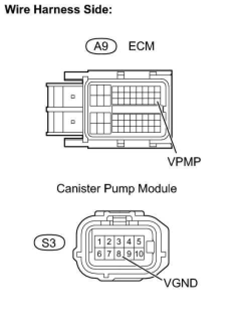 (c) Measure the resistance between terminal VPMP of the ECM connector and terminal VGND of the canister pump module connector.