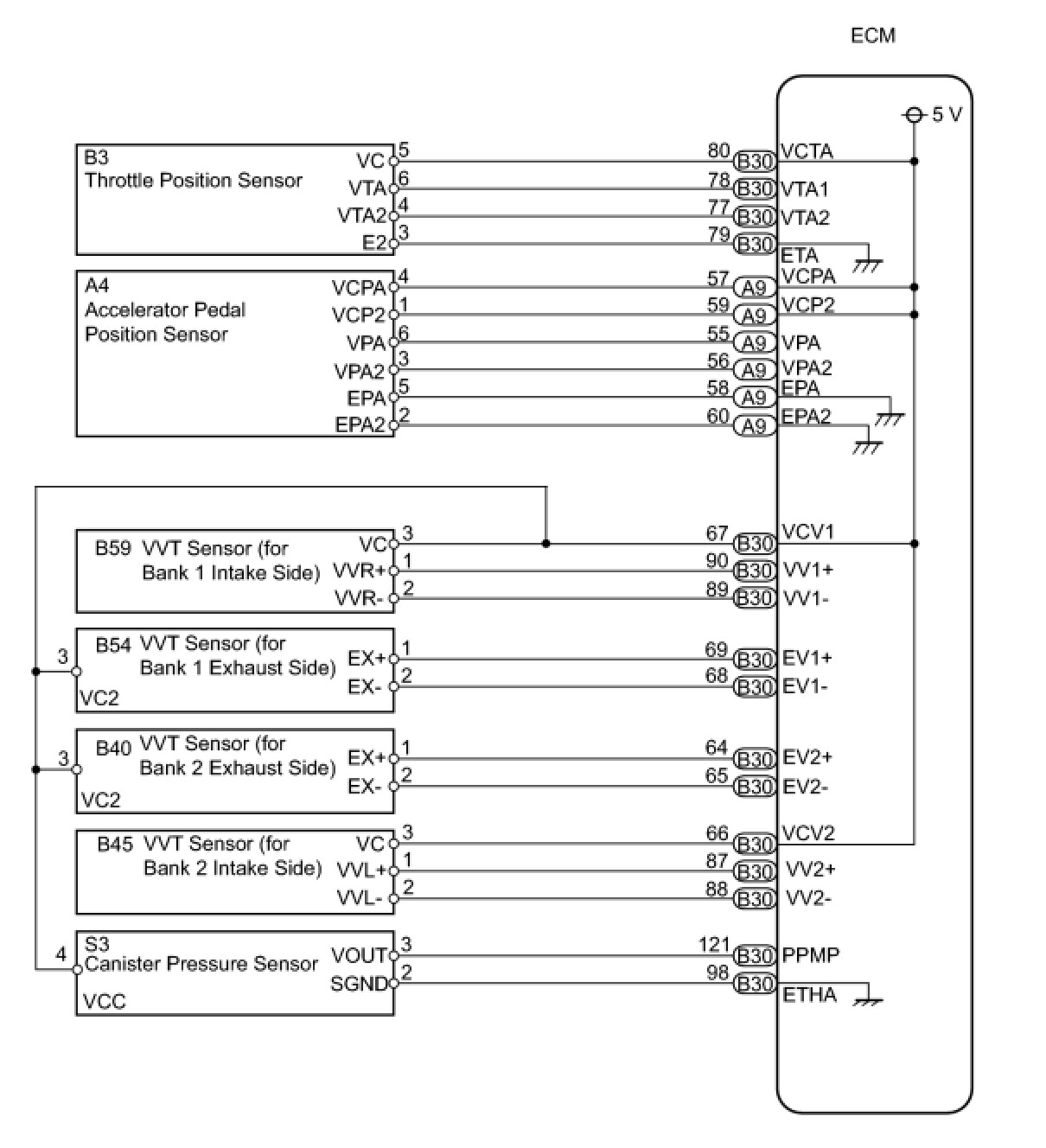 The ECM constantly generates a 5 V power source voltage from the battery voltage supplied to the +B (BATT) terminal to operate the microprocessor. The ECM also provides this power source voltage to the sensors through the VC output circuit.