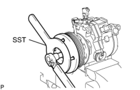 (f) Using SST, hold the magnet clutch hub and install the bolt.