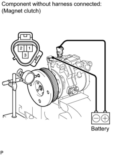 (c) Connect the battery positive lead to terminal 3 of the magnet clutch connector and the negative lead to the ground wire. Turn the magnet clutch on and off and measure the clearance.
