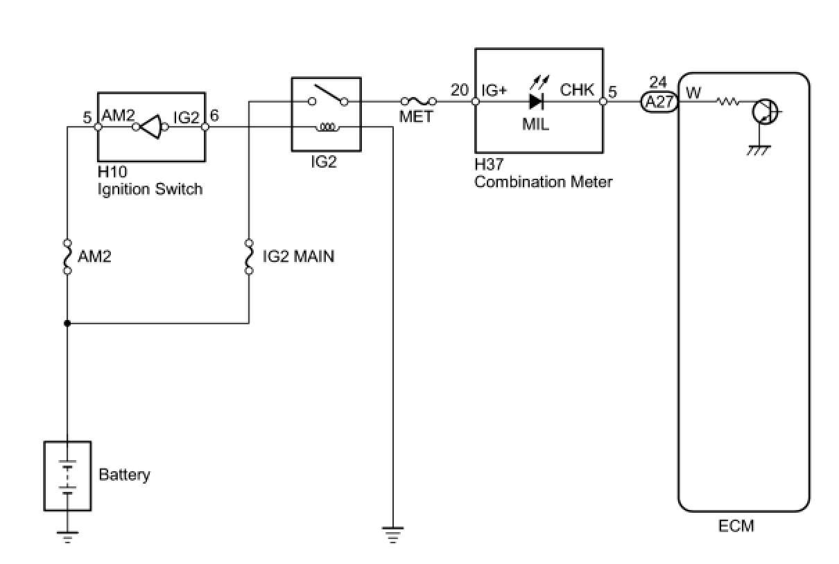 The MIL (Malfunction Indicator Lamp) is used to indicate vehicle malfunction detections by the ECM. When the ignition switch is turned ON, power is supplied to the MIL circuit, and the ECM provides the circuit ground which illuminates the MIL.
