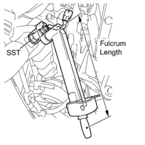 - Use a torque wrench with a fulcrum length of 30 cm (11.8 in.). If using a torque wrench with a length that is not 30 cm (11.8 in.), calculate the torque specification for the torque wrench and SST based on the "without SST" torque specification Service Precautions.