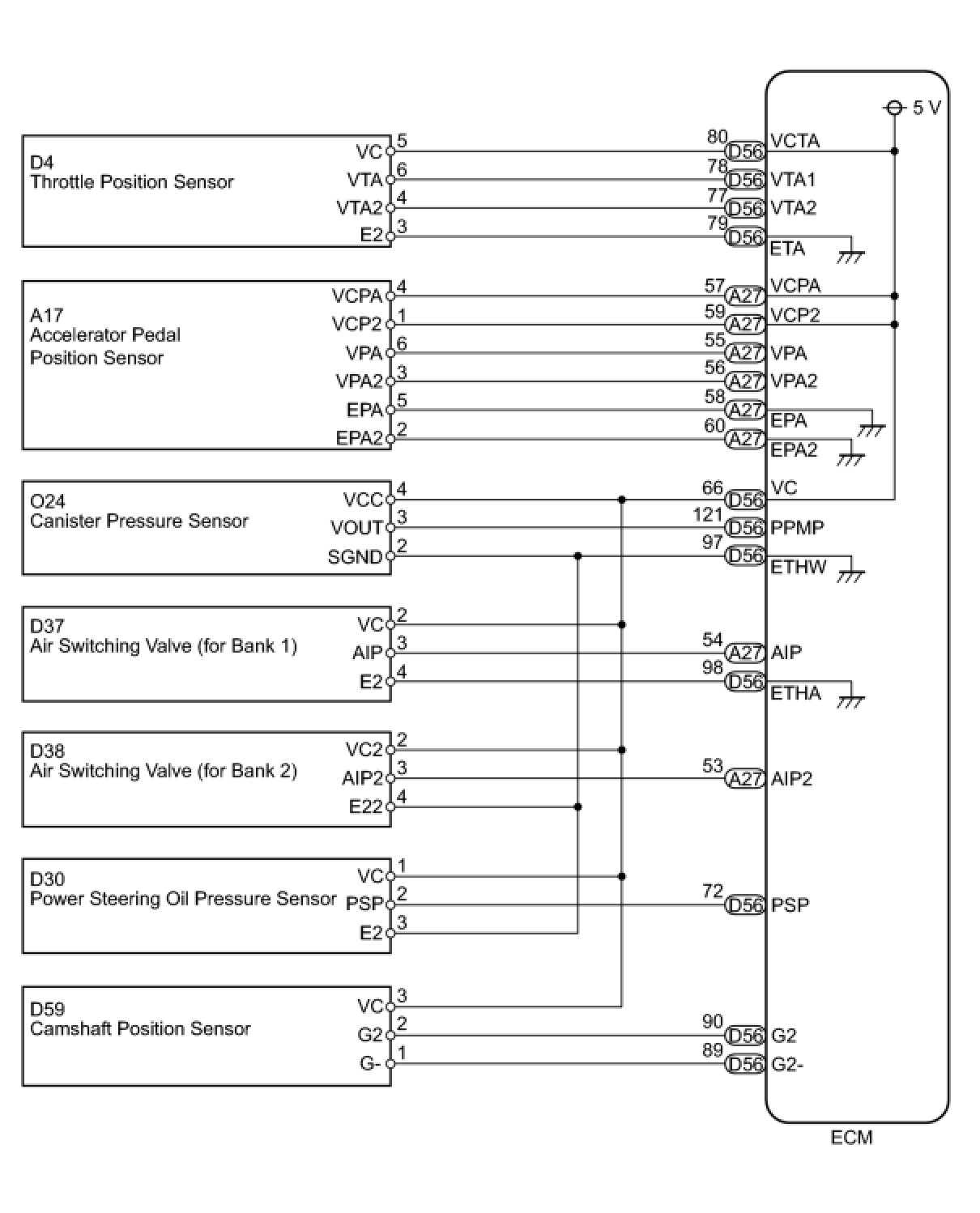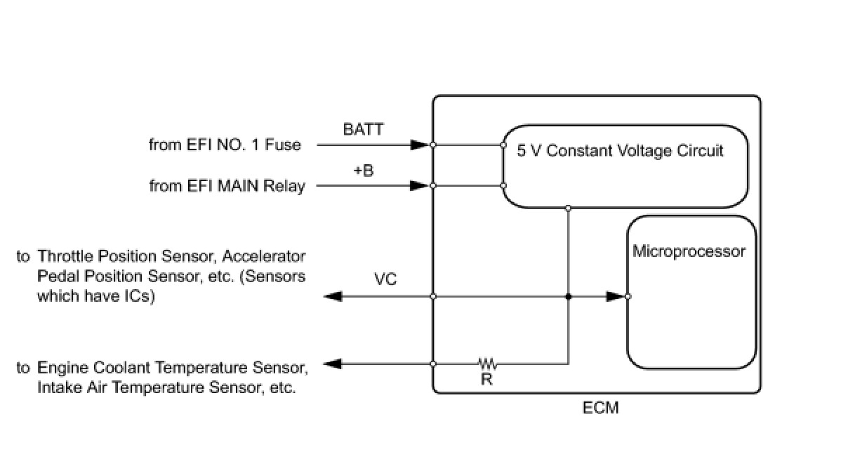 The ECM constantly generates 5 V power from the battery voltages supplied to the +B (BATT) terminal to operate the microprocessor. The ECM also provides this power to the sensors through the VC output circuit.