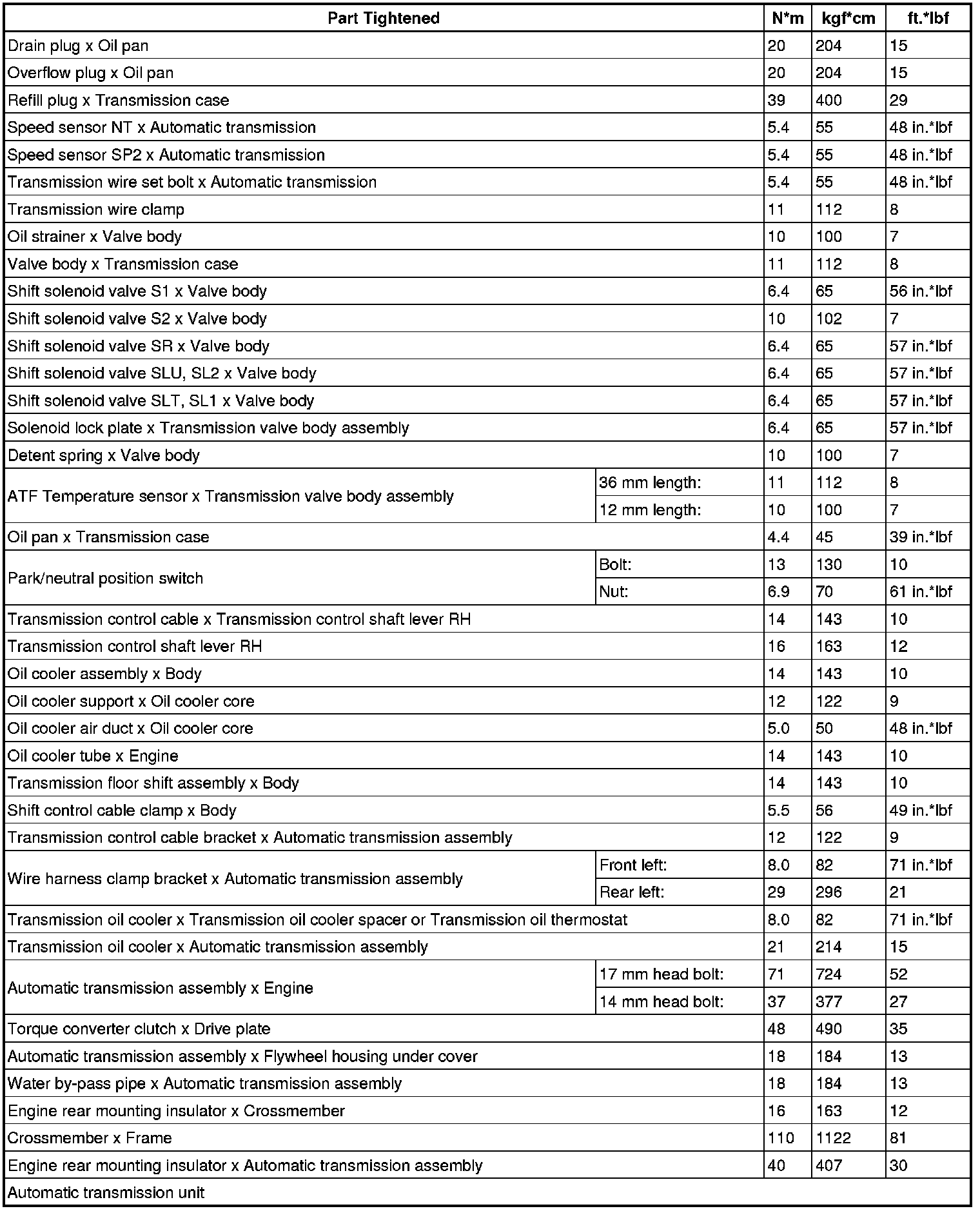 SPECIFICATIONS: A750E AUTOMATIC TRANSMISSION / TRANSAXLE: TORQUE SPECIFICATIONS